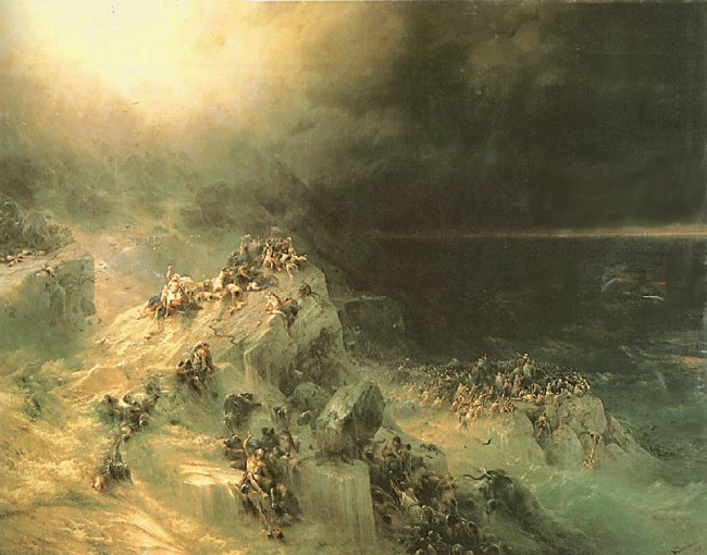 Но на восьмой день темные облака заволокли небо. Послышались раскаты грома, и сверкнула молния. Вскоре упали первые тяжелые капли дождя. Люди никогда раньше не видели ничего подобного, и теперь страх овладел всеми. Они вполголоса спрашивали друг друга: “Неужели Ной был прав, и весь мир обречен на погибель?” Все мрачнее и мрачнее становилось небо, и все усиливался дождь. Отовсюду слышался рев животных, мечущихся в диком ужасе, своими отчаянными воплями они, казалось, оплакивали и собственную участь, и судьбу человека. Тогда “разверзлись все источники великой бездны, и окна небесные отворились”. Словно мощные водопады обрушились на землю. Реки вышли из берегов и затопили равнины. С невиданной силой из недр земли вырвались мощные струи воды, выбрасывая на сотни футов вверх огромные каменные глыбы, которые, падая, образовывали глубокие воронки.